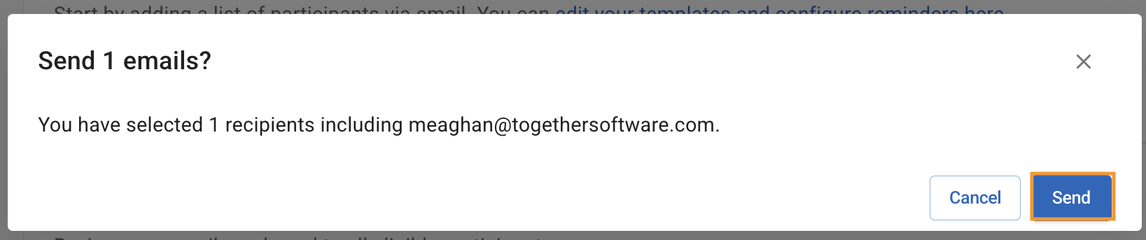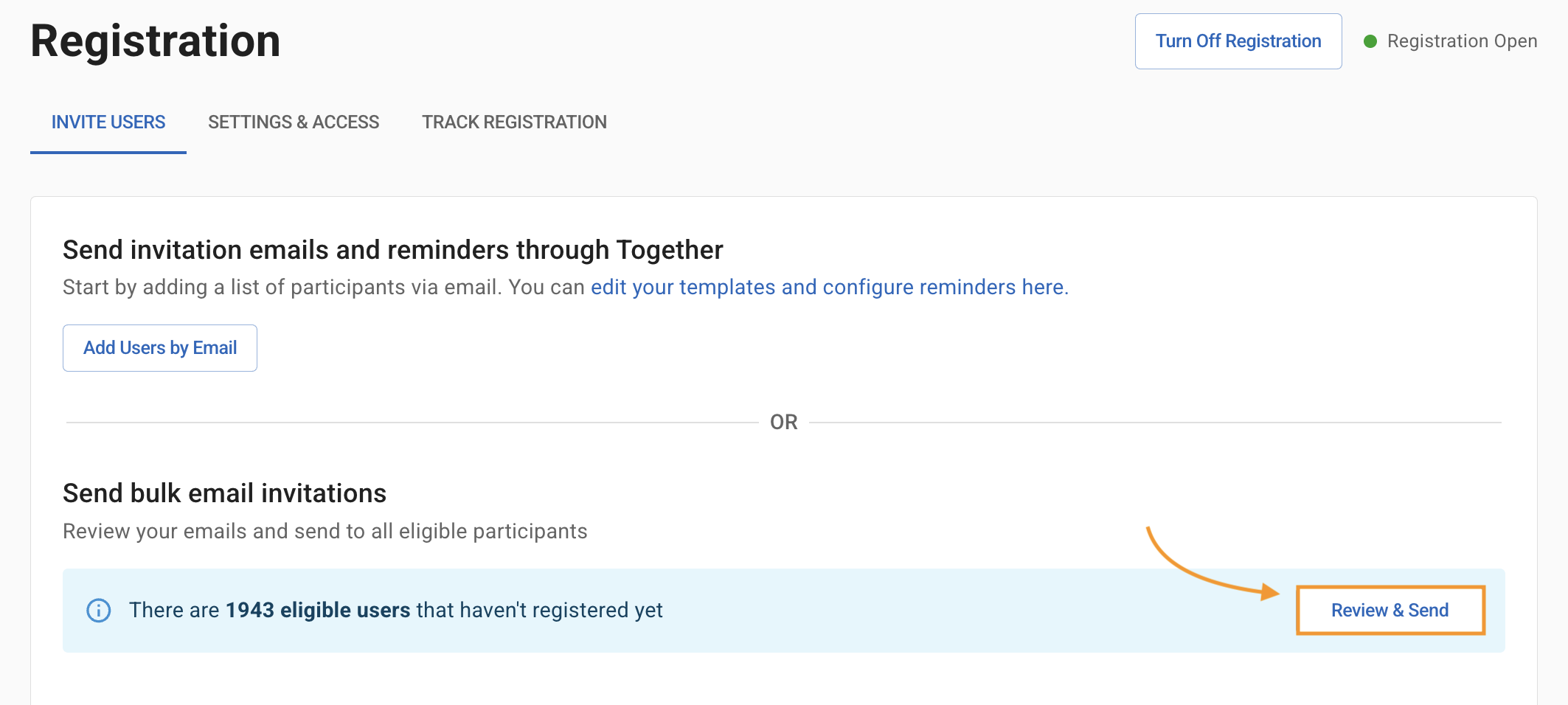 Here you can use our Bulk Email feature to send out registration invites to all eligible users within your organization (Note: if they have already registered for this program, they will not receive an email). To do so, click on the Review & Send button. This will bring up a prompt showing you a few of the recipients that these invites would be sent to, along with the total number of eligible users who would receive the email. Click the Send button to send all of these emails: