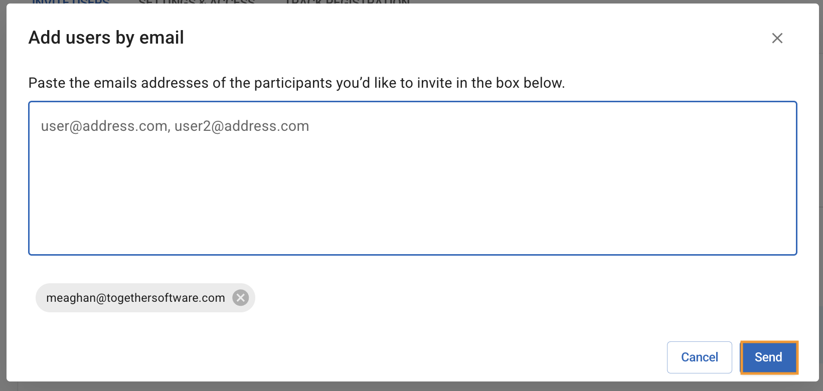 Here you can send individual email invitations by typing or pasting them into the text box, clicking Enter, and then once each email has been validated, you may click the Send button: