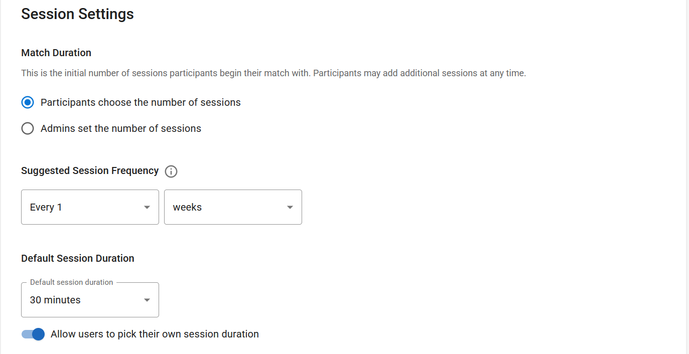 The match duration setting allows you to enable participants to choose the number of sessions, or allow admins to set the number of sessions. Participants can add more sessions at any time.