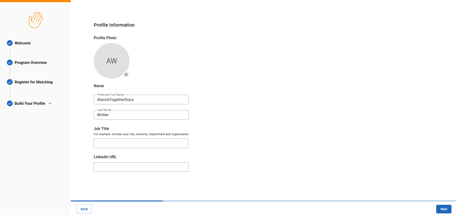 Tell us a bit about yourself! Fill in your preferred name, your current role or department, and link your LinkedIn profile. Once you've filled these in, click 'Next' to proceed.