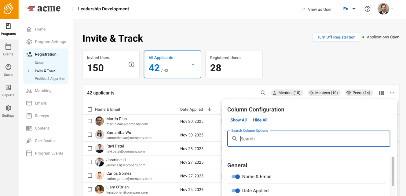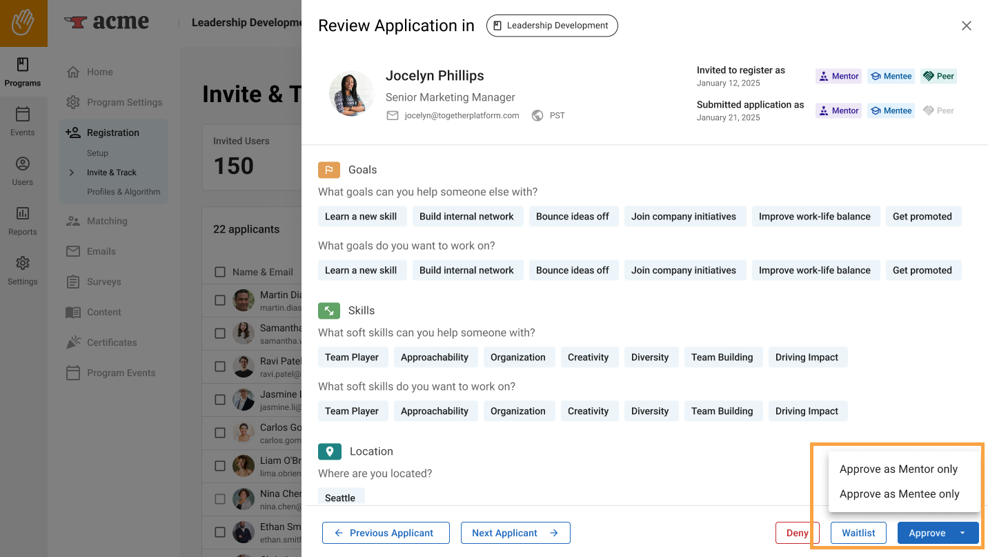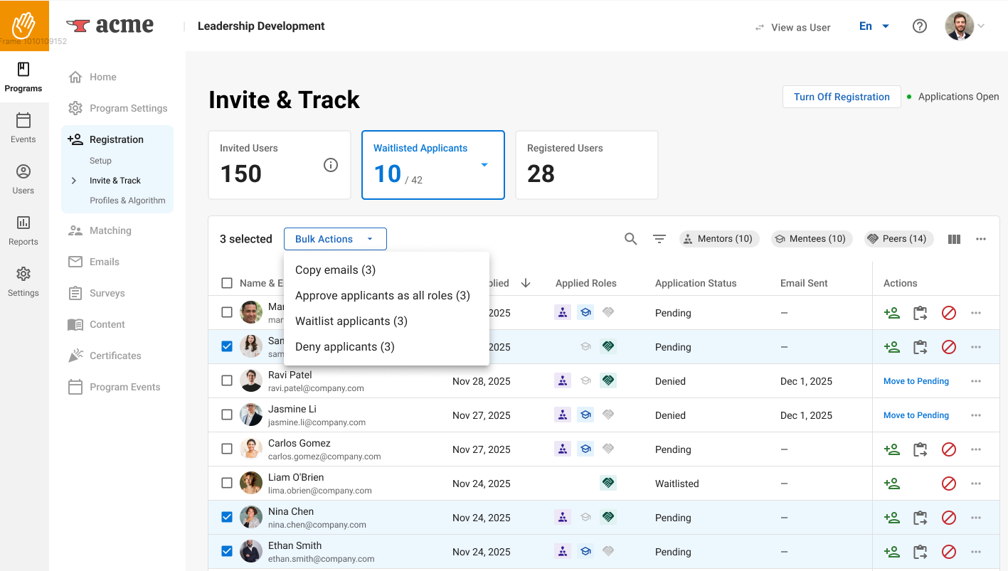 In some cases, you may want to invite a broad audience to your program while retaining control over who is ultimately approved to participate and be matched. Using applications allows you to review and approve participants before they gain access.